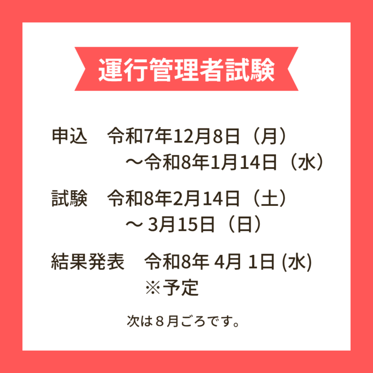 令和7年度第2回運行管理者試験の日程が発表されました。 申込 令和7年12月8日(月)~令和8年1月14日(水) 試験 令和8年2月14日(土)~ 3月15日(日) ※予約の際に希